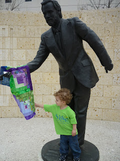 Then we visited the nearby campus of the University of Houston. Here Tris is pointing to my quilt block at the Statue of the Four Lies.